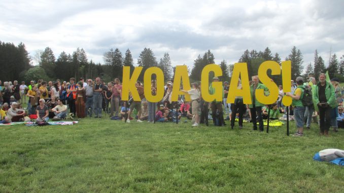 Nach Schätzung des Autors gingen rund 800 Teilnehmer von der St. Nikolaus-Kirche zum Bohr-Areal. Die Veranstalter sprachen von 1200, die Polizei von nur 600. Die Bewohner standen Spalier oder sahen von ihren Gartenstühlen zu. „Jetzt und hier nach Gas bohren zu wollen, ist ein schwerwiegender klimapolitischer Fehler”, sagt Franziska Wild von Fridays for Future Bayern. „Jede neue Gas-Förderung beschleunigt die Erderhitzung. Das gilt für die geplante Bohrung in Reichling, aber auch für jedes andere neue Gas-Projekt in Deutschland und weltweit.“ Darauf ging auch der nächste Redner auf der Kundgebung am Bohrplatz ein: Kasimir Buhr vom Bund Naturschutz.