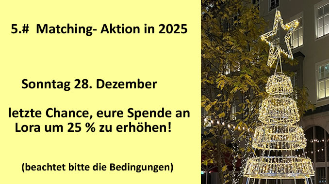 Am Sonntag 28. Dezember gibt es nun erneut die Möglichkeit auf Einzelspenden an Lora noch mal 25% oben drauf zu bekommen!