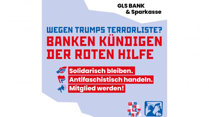 Innerhalb weniger Tage haben die GLS Bank und die Sparkasse Göttingen über 60 Kontoverbindungen der Roten Hilfe e. V. gekündigt. Sie ist die älteste und größte Organisation innerhalb der linken Szene, mit rund 19.000 Mitgliedern: Seit mehr als 100 Jahren unterstützt die Rote Hilfe linke Gefangene, übernimmt Prozesskosten oder verschafft ihren Verfahren Öffentlichkeit. Für die Organisation, die jährlich knapp zwei Millionen Euro aus Beiträgen und Spenden verteilt, bedeutet das einen schweren Schlag: Ohne Konten lässt sich schwer finanzielle Solidarität für Betroffene und Gefangene organisieren, keine Anwält:innen bezahlen, etc.