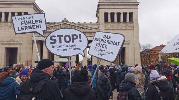 Am Sonntag, den 29. März fand in München eine Kundgebung gegen sexualisierte digitale Gewalt an Frauen statt. Aktueller Anlass ist der Fall der Schauspielerin und Moderatorin Collien Fernandes. Fernandes wirft ihrem Ex-Partner vor, unter ihrem Namen Fake-Accounts bei (a)sozialen Medien betrieben und pornografische Videos und Bilder an Männer verschickt zu haben. 6.000 Menschen bekundeten ihre Solidarität mit Collien Fernandes und allen weniger prominenten betroffenen Frauen. Und das im spätwinterlichen, nassen Wetter auf dem Königsplatz.