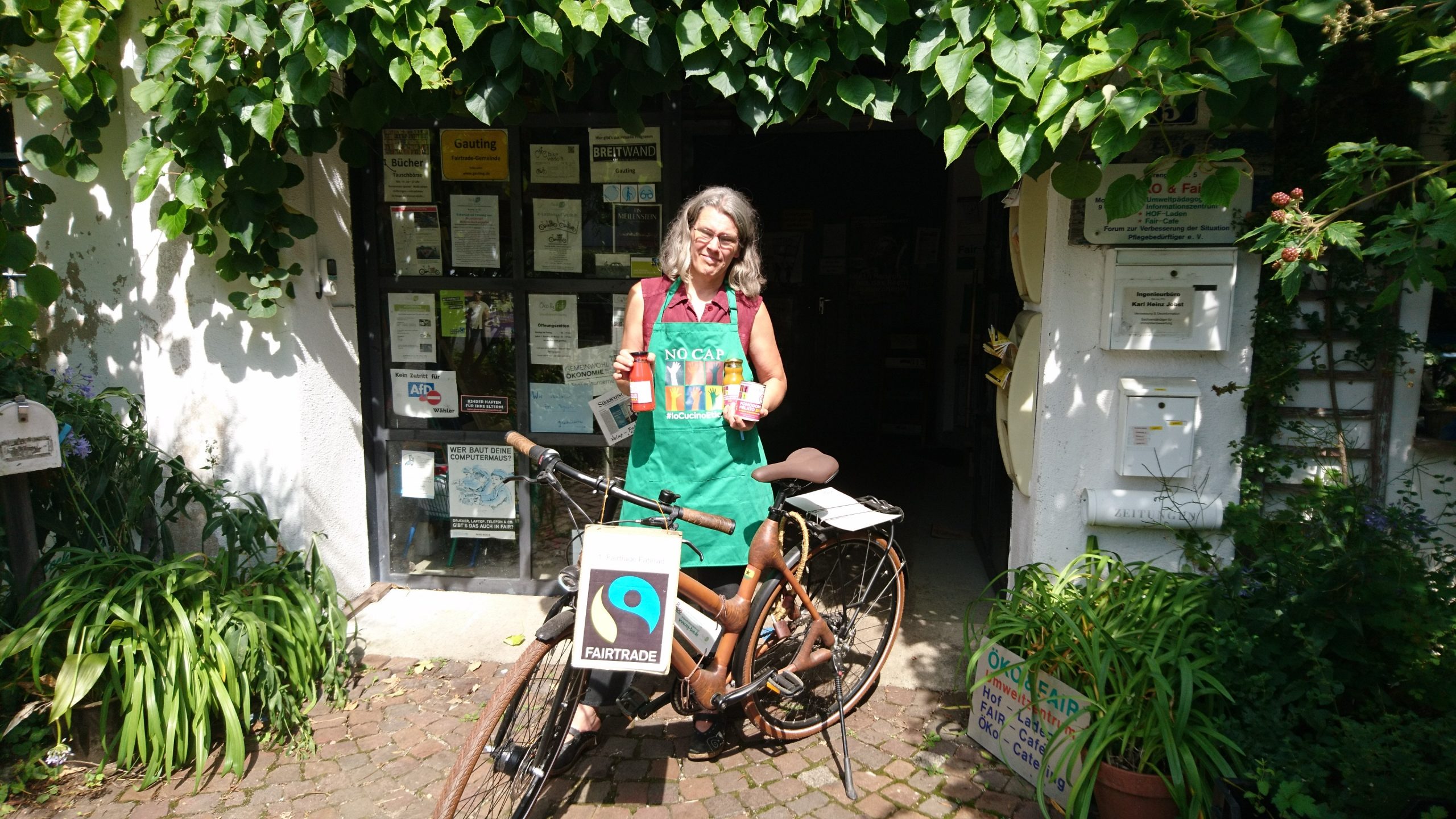 Christiane-Lüst Christiane Lüst vor dem Eingang des Umweltzentrums mit NoCap-Produkten und einem Fairtradefahrrad – Foto: Nick Bergner